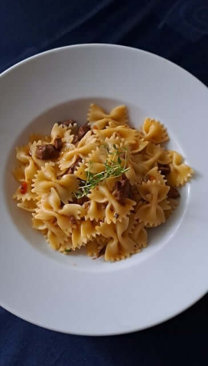 1. 파르팔레 파스타를 끓는 물에 약 11분 삶고 찬물에 헹굽니다.