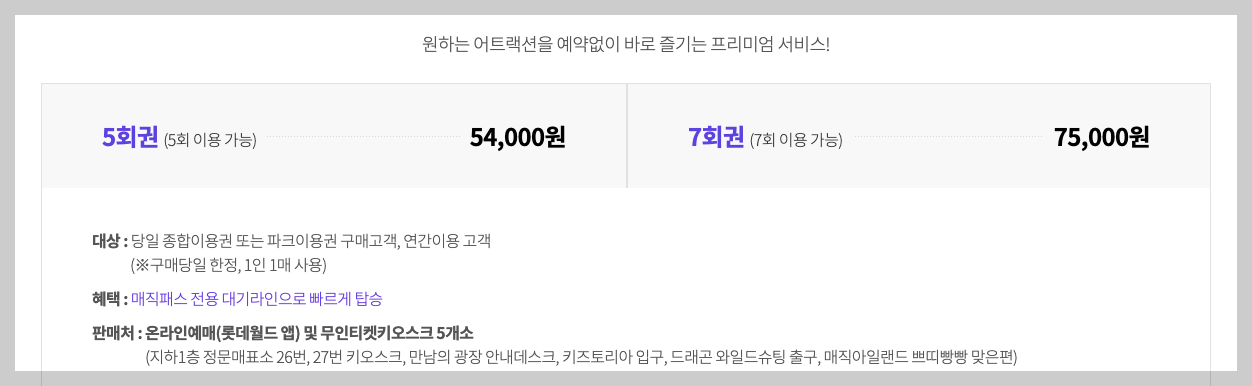- 롯데월드 정문 키오스크 또는 매직패스 프리미엄 전용 부스에서 구매