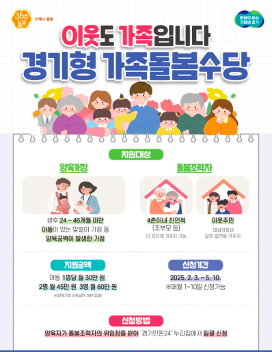 조부모 돌봄 수당의 대상자는 가족돌봄수당을 지급받을 수 있는데요, 지원하는 해당 지역에 거주하는 생후 만 24개월부터 48개월 미만 아동이 있는 가정에서 신청할 수 있습니다.