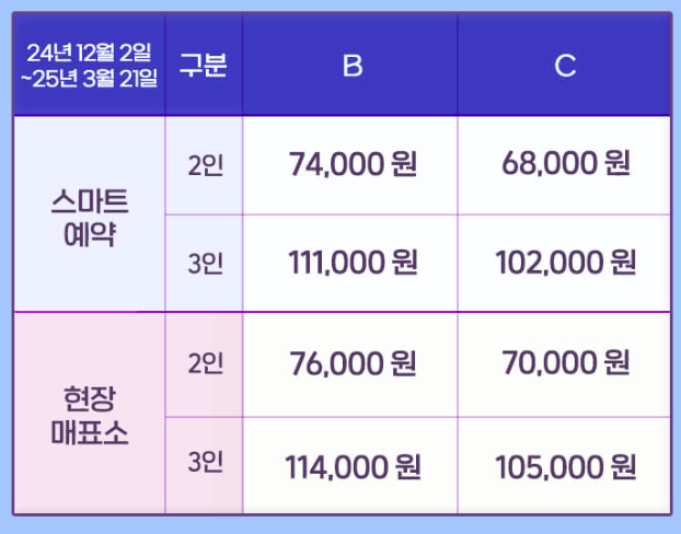 방문하는 시기의 가격이 조금 다른데요, 2025년 3월까지 해당하는 세트권 가격은 아래와 같습니다.