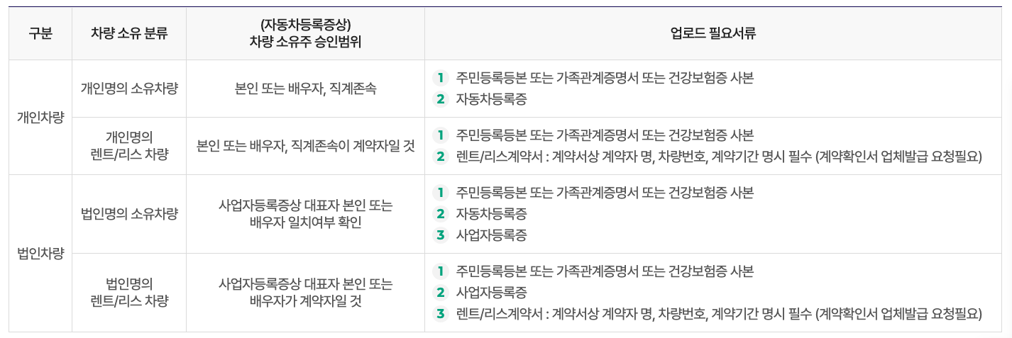 ex) 직계존속 명의 차량일 경우, 해당인이 포함된 가족관계증명서 첨부 必