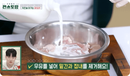 2. 소금, 후추로 밑간을 한 다음, 우유를 넣어 잡내를 제거합니다.