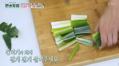 4. 어묵을 길고 얇게 썰어서 육수에 넣어 끓여주세요.