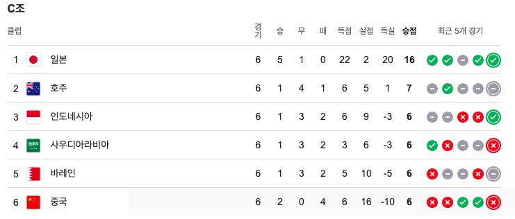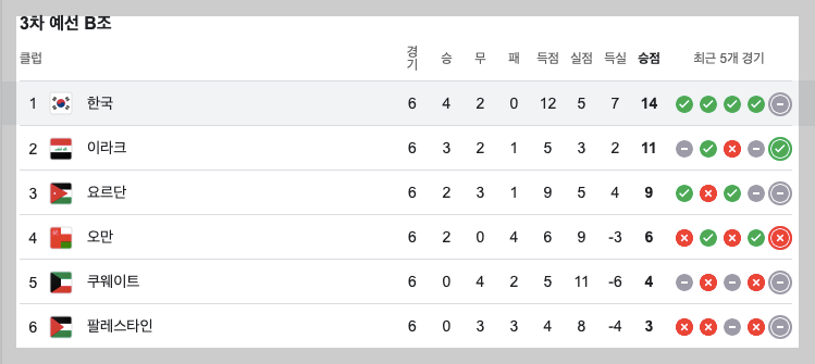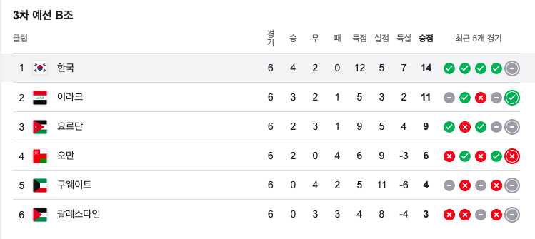 월드컵 아시아 3차예선 한국 축구 조별순위는 현재 6팀 중 1위입니다. 6경기중 5경기를 치뤘고 결과는 아래표와 같습니다.