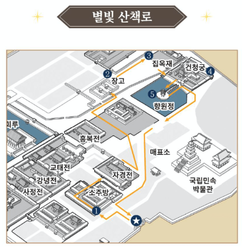 경복궁 별빛야행 산책로입니다. 소주방을 시작으로 장고, 집옥재, 건청궁, 향원정을 둘러보게 됩니다. 해설과 함께 아름다운 고궁을 거닐면서 고즈넉한 감성에 젖을 수 있는 소중한 시간이 될 것 같습니다. 향원정의 아름다운 불빛은 마치 별이 주변에 떠다니는 듯한 절경을 보실 수 있습니다.