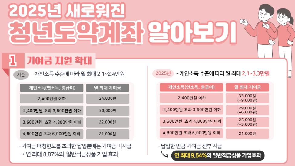 • 청년도약계좌에 3년 이상 가입을 유지하면, 중도해지 시에도 이자소득세(15.4%)가 비과세(2025년 1월 1일부터 시행)