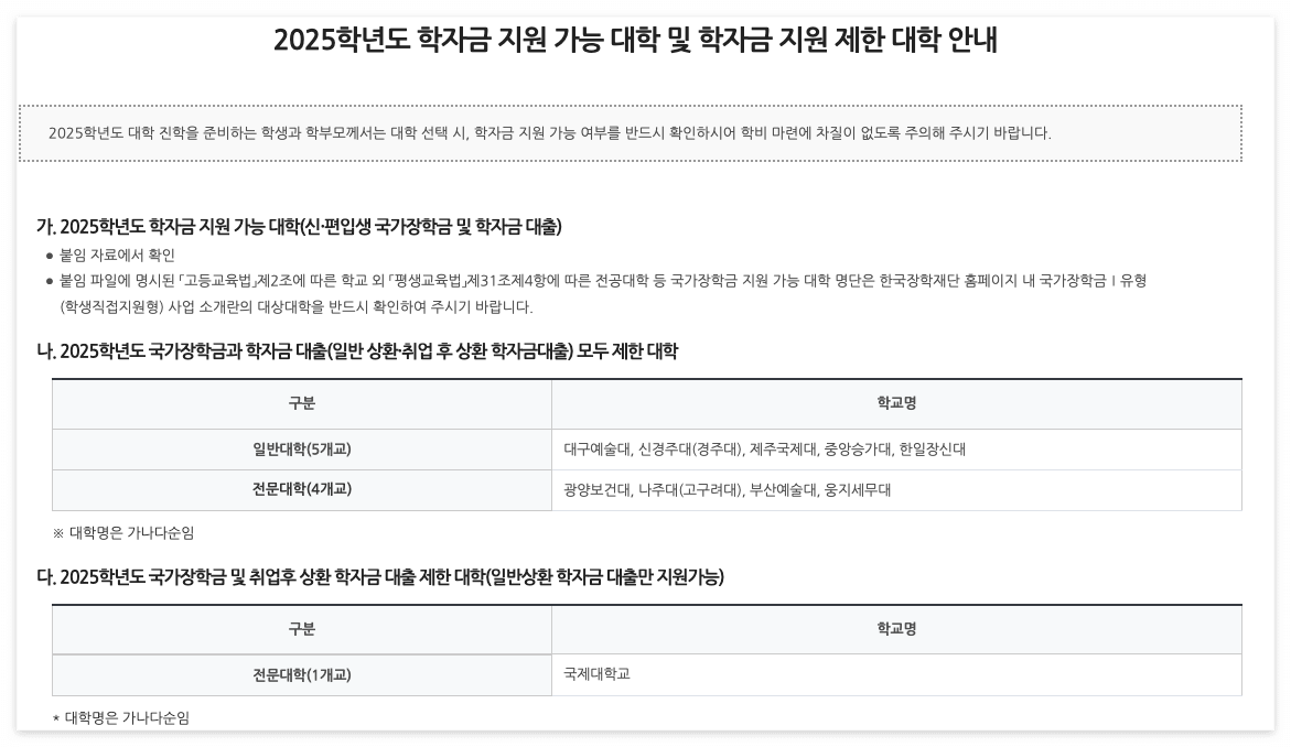 2025년 국가장학금 중 일부 대학이 지원대상에서 제외되었습니다.