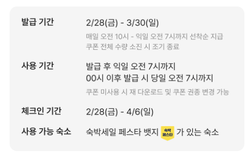 | 쿠폰 발급처 | 네이버, 야놀자, 여기어때 등 숙박 예약 가능한 사이트 |