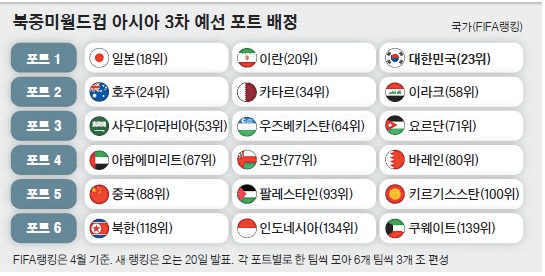 우리나라는 포트 1 배정에서 일본, 이란 등과 나란히 있어서 월드컵 예선 3차전에서는 만날 일이 없습니다. 하지만 포트 2의 호주는 만만치 않은 상대이기 때문에 우리 한국팀의 예선 3차전의 팀 매치 결과를 긴장하면서 기다리고 있습니다. 포트 3의 사우디아라비아도 피파 랭킹은 낮지만 최근 전력이 꾀 올라갔기 때문에 만만치 않은 상대로, 호주와 같이 만나지 않았으면 하는 팀입니다.