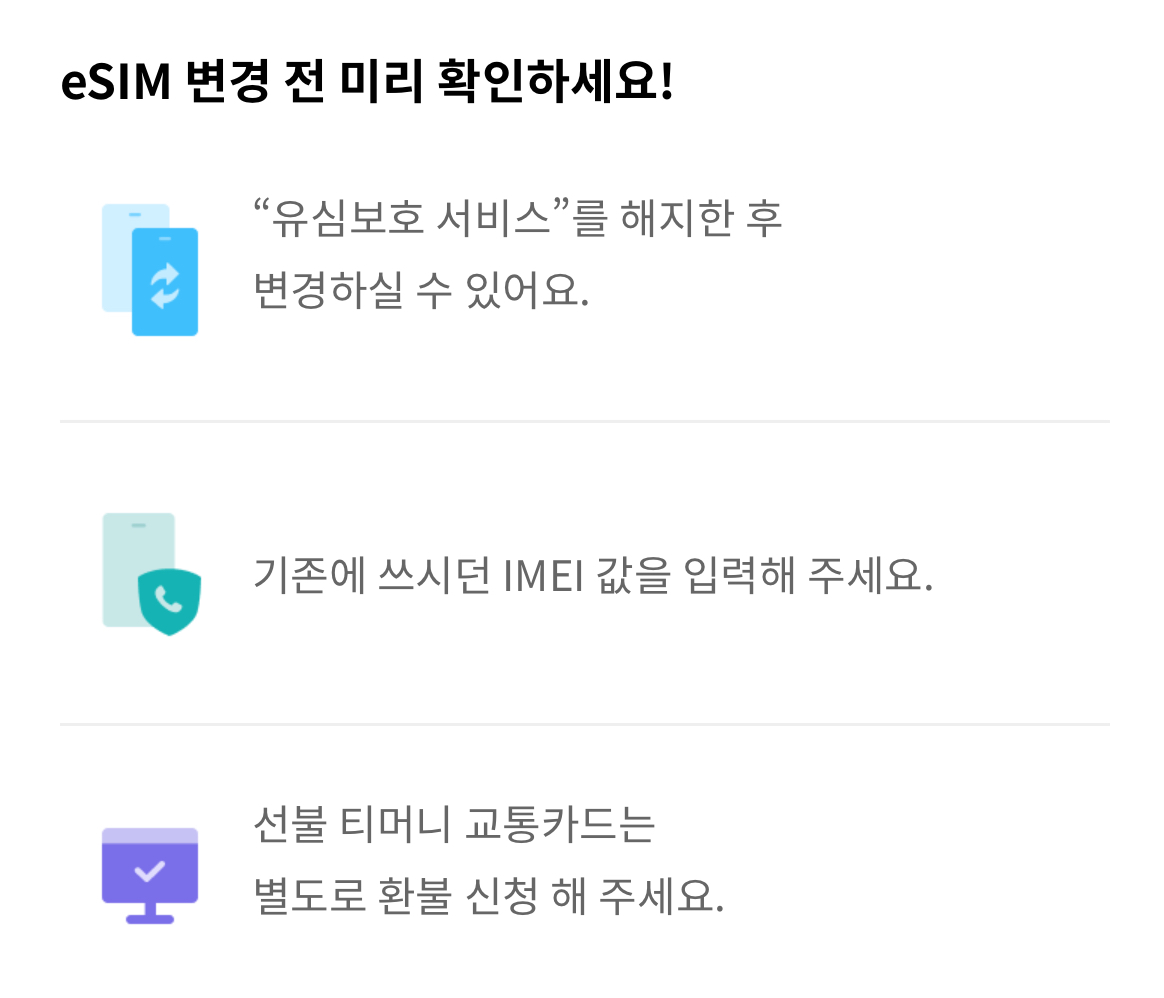 - 다른 기기로 번호 이동 시 불편 : 기존 이심을 삭제 후 다시 등록해야합니다.